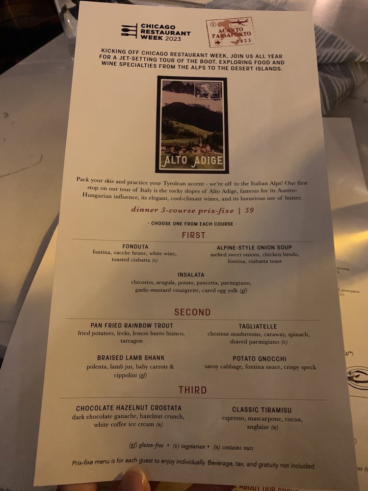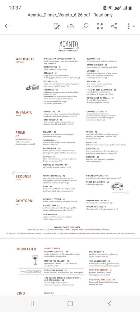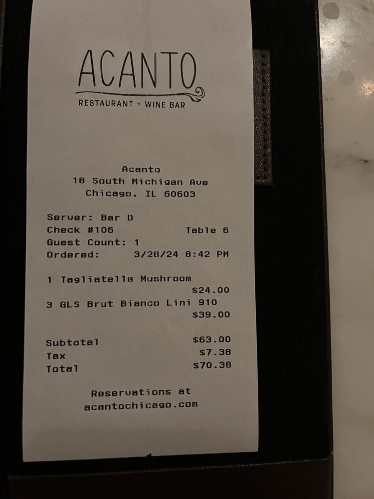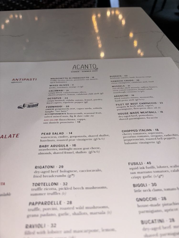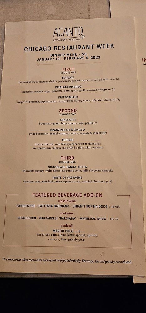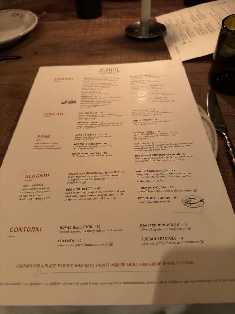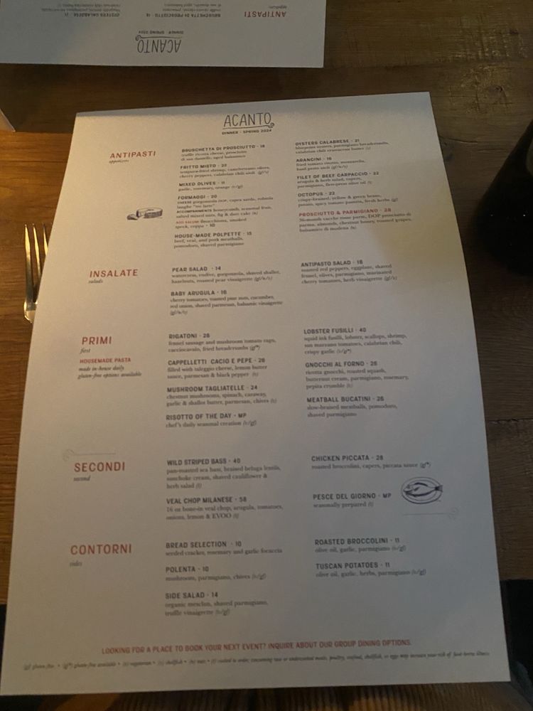 Introducing Acanto, a classy Italian wine bar located in the heart of Chicago. Acanto offers a variety of appetizers, soups, salads, and entrees, all crafted with attention to detail and flavor. Highlights from the menu include the bruschetta di prosciutto, arugula salad with strawberries, and short rib rigatoni. The ambiance at Acanto is romantic, with dim lighting and taper candles, making it a perfect spot for a date night or special occasion. The service is top-notch, with attentive staff who ensure a pleasant dining experience. Acanto also offers an impressive assortment of wines to complement your meal. Overall, Acanto is a must-visit for those looking for delicious Italian cuisine in a sophisticated setting.